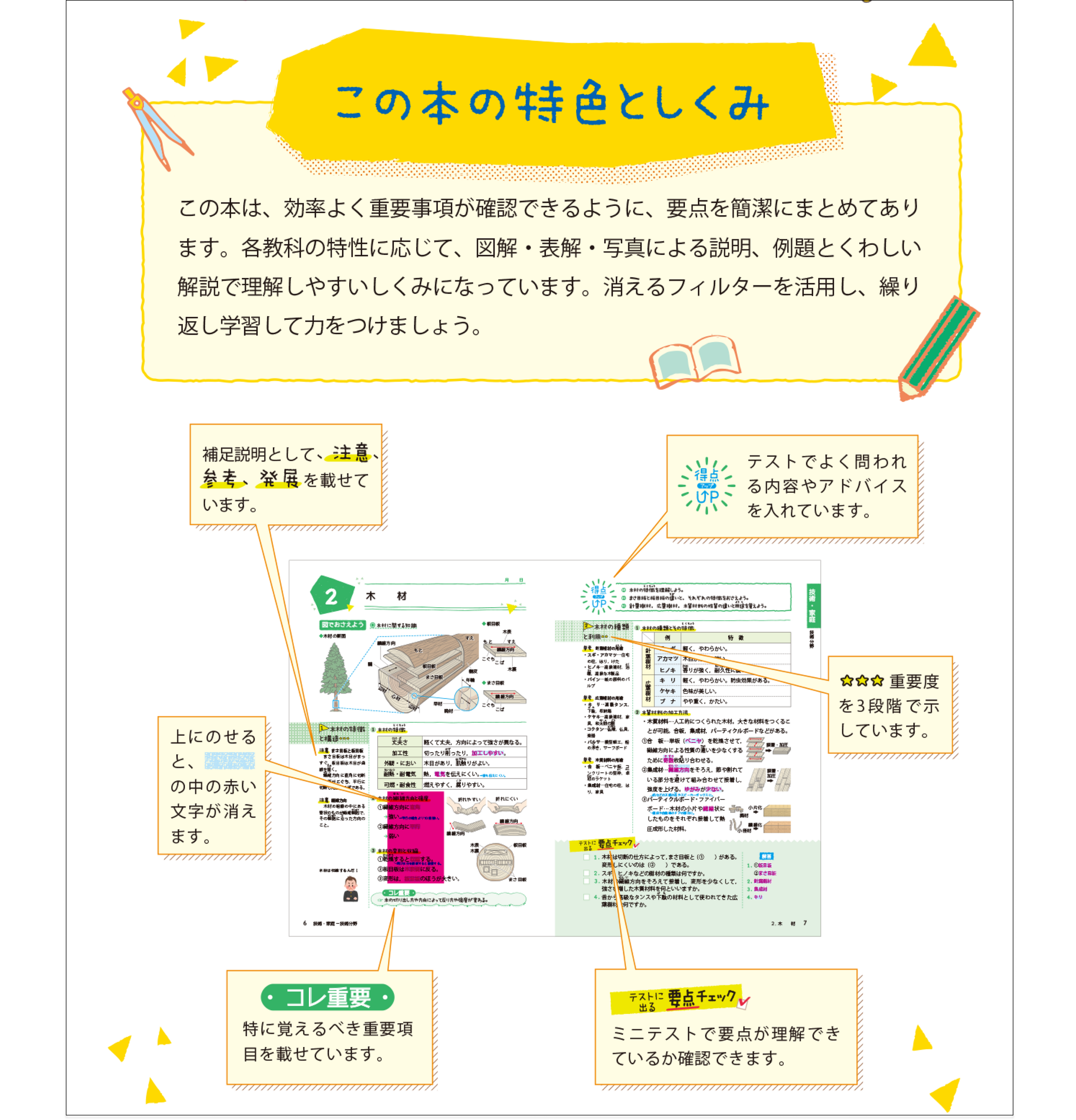 「コレ重要」「得点UP」「テストに出る要点チェック」などで要点を簡潔にまとめ、例題や詳しい解説で理解しやすい仕組みになっています。3段階(★★★が最重要)で表示している各単元の重要度も確認しながら、効率よく学習できます。