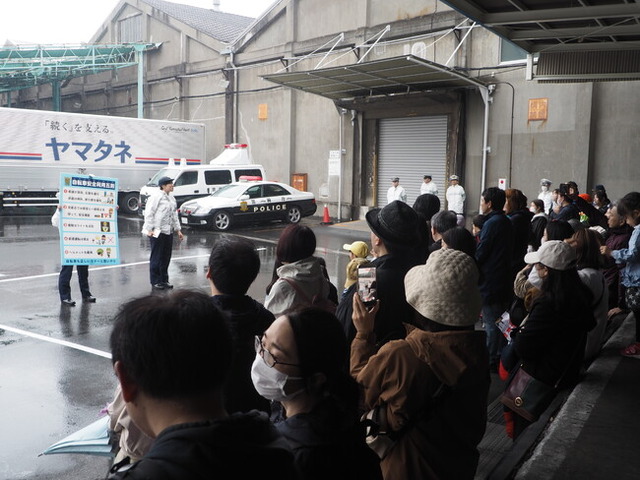 当日は、あいにくの雨天となってしまいましたが、事前にご案内させていただいた江東区内にお住まいの新小学1年生・2年生・3年生の児童の方々および保護者の方々約60名にお越しいただき、交通安全の啓発活動へのご参加やトラックへの試乗体験、パトカーや白バイ、フォークリフトなどの「はたらくくるま」との記念撮影など、楽しみながら交通安全の重要性を体感していただきました。