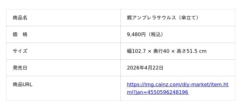 雨の日、ひょっこり現れるのは…カサを背負った恐竜です。入口のすみっこで、今日も静かにあなたの傘をお預かりします。ちょっと憂うつな雨の日も、サウルスたちがいれば少しハッピーになるかもしれません。背中には約30本の傘をしっかり収納します。置く場所の雰囲気に合わせて防水マットや人工芝を敷けば、床も濡れずに安心です。折りたたみ傘も引っ掛けやすい、工夫された差し込み棒が付いています。しかも、組み立ては簡単3ステップ!子どもでも迷わず完成できちゃう、やさしい設計です。[画像11: https://prcdn.freetls.fastly.net/release_image/8255/647/8255-647-5ad1c1e4a22c7f44fd7e62a090b376c0-3900x2600.jpg?width=536&quality=85%2C75&format=jpeg&auto=webp&fit=bounds&bg-color=fff ]