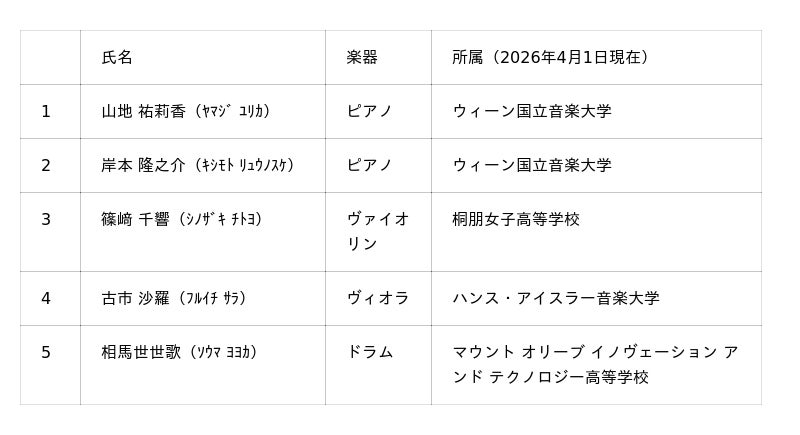 ヤマハ音楽振興会(本部:東京都目黒区、理事長:中田卓也)は、将来音楽界の第一線での活躍が期待される若手音楽家を対象に支援を行う、ヤマハ音楽支援制度「音楽奨学支援」の2026年度支援対象者5名を決定しました。