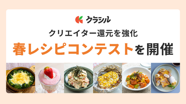 クラシル株式会社(本社:東京都港区、代表取締役社長:堀江 裕介、以下「クラシル社」)が運営するレシピ動画サービス「クラシル」は、同アプリ内においてレシピを投稿するクリエイターへの還元強化を目的に、レシピ投稿コンテスト「クラシル 春レシピコンテスト2026」を、2026年4月23日(木)10時より開始いたします。