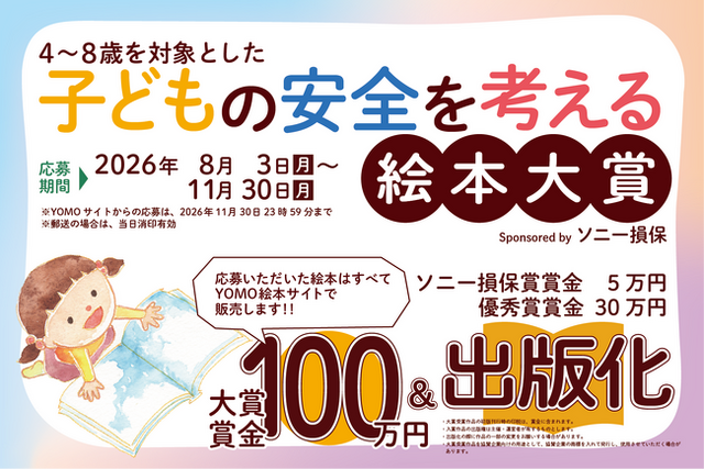 株式会社ニコモ(代表取締役:犬養 岬太/本社:東京都文京区/以下 ニコモ)は、2026年8月3日(月)より、ソニー損害保険株式会社(代表取締役社長:鈴木 隆行/本社:東京都大田区/以下 ソニー損保)が協賛する『子どもの安全を考える絵本大賞 Sponsored byソニー損保』を開催いたします。