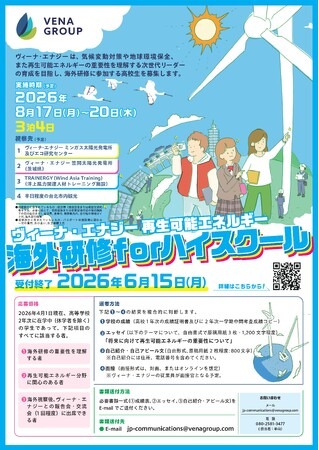 アジア太平洋地域でグリーンソリューション事業を展開するヴィーナ・グループ(Vena Group)は、 海外研修プログラム 第4回「ヴィーナ・エナジー再生可能エネルギー海外研修 for ハイスクール」を2026年8月17日より開催することを発表しました。