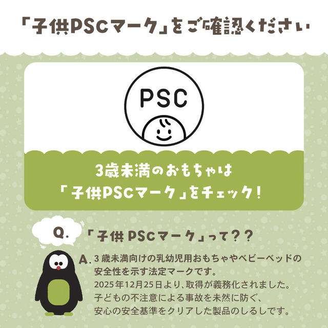 [画像2: https://prcdn.freetls.fastly.net/release_image/79792/938/79792-938-c9871a667063ae988c8fe6af8b732e2b-1040x1040.jpg?width=536&quality=85%2C75&format=jpeg&auto=webp&fit=bounds&bg-color=fff ]2025年12月25日より義務化された、3歳未満向け玩具の安全基準「子供PSCマーク」