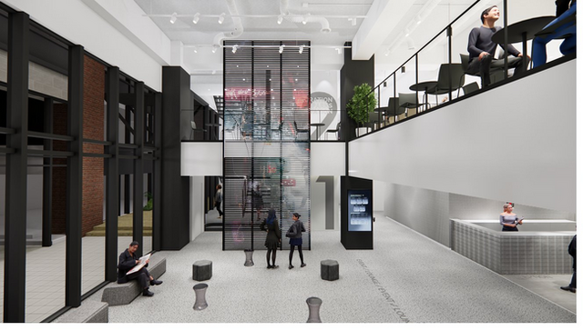 【エントランス】日本初導入の高解像度巨大透過型LEDが来訪者を迎えるエントランス【ホール】壁一面を覆う大迫力のLEDビジョンを備えた多目的ホール
