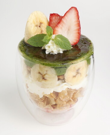 甘熟王バナナのコクのある甘みと、当店自慢の抹茶の深い味わいに、レモンゼリーの爽やかな酸味とイチゴの鮮やかな彩りを添えました。軽やかで奥行きのある味わいをぜひお楽しみください。