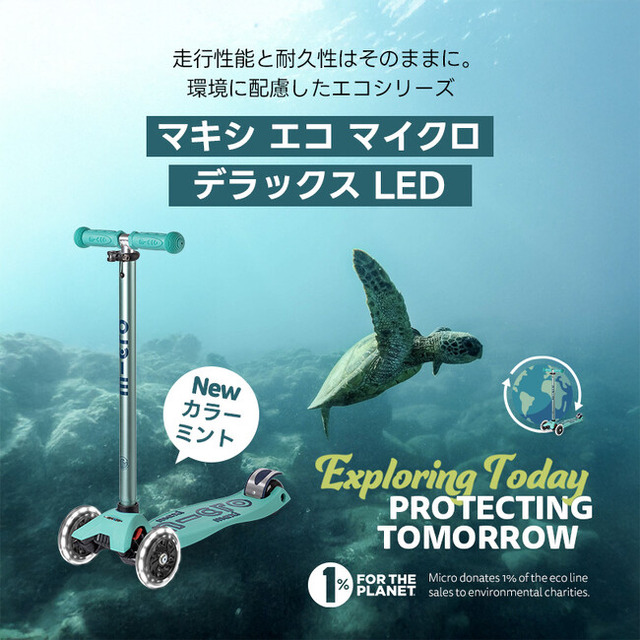 「マキシ エコ マイクロ デラックス LED」は、5歳以上の子どもを対象とした三輪キックスクーターで、体重移動によって方向転換を行う「リーン&ステア構造」(特許取得)を採用。走行時に自動発光するLEDホイールを搭載し、安全性と楽しさを両立している。製品重量は約2.75kg、耐荷重は50kg。