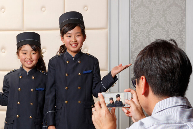 ホテルマン体験プランでは、ベルマンの制服を着用し、接客用語やお辞儀、館内案内や客室の説明方法を学ぶ、現役ベルマンによる約30分間の個別レクチャーを実施します。研修後は、学んだ所作を実践し、ご家族をお部屋までご案内していただきます。
