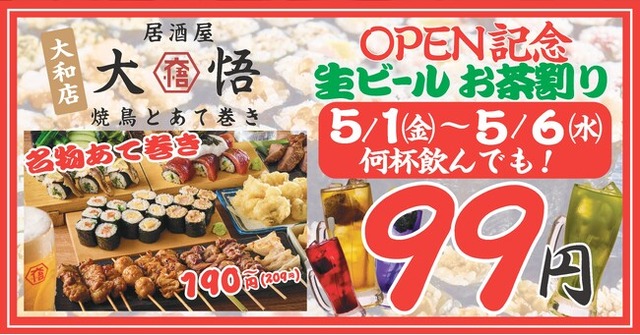 さらにオープンから6日間の5月1日(金)~6日(水)には、生ビール&お茶ハイ99円キャンペーンを開催。