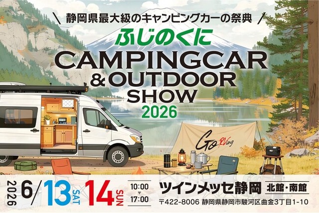 ふじのくにキャンピングカー&アウトドアショー実行委員会(事務局:株式会社ネオプロジェクト)は、2026年6月13日(土)~14日(日)に「ふじのくにキャンピングカー&アウトドアショー2026」を開催することをご報告いたします。本イベントは、キャンピングカーの最新モデルやアウトドアグッズの展示販売をはじめ、ステージイベントや体験型コンテンツなど、幅広い世代が楽しめる内容となっております。今年は、人気お笑い芸人「どぶろっく」「ムカイワンダーランド」「ゆってぃ」や、静岡県でおなじみのタレント「久保ひとみ」の出演が決定しました。道関係者の皆様におかれましては、ぜひご掲載・お問い合わせのほど、よろしくお願い申し上げます。