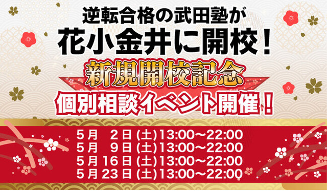 学習塾「武田塾」を全国に展開している株式会社A.ver(本社:東京都文京区 以下「武田塾」)は、5月1日、東京都花小金井に武田塾花小金井校を開校することをお知らせいたします。武田塾花小金井校の開校を記念して、花小金井校では個別相談イベントを実施いたします。開催予定は以下の通りです。5月2日(土) 13:00~22:005月9日(土) 13:00~22:005月16日(土) 13:00~22:005月23日(土) 13:00~22:00