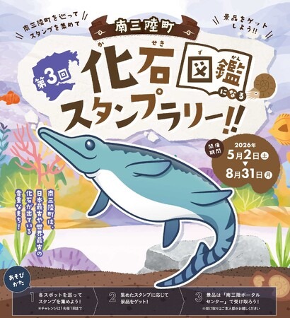 「化石スタンプラリー」は今年で第3回目となる「化石」×「スタンプラリー」企画です。今年はGW~夏休み中にイベントを開催。南三陸町内の様々なスポットを巡り、町から実際に発見された「古生物」たちのスタンプを集めていきます。スタンプラリーブックを埋めていくと化石図鑑が完成します。本イベントは第3回の開催となり、前回までの内容を一部見直し、より多くの来訪者に楽しんでいただけるようアップデートしています。