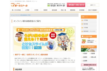 第一ゼミナールは2020年7月5日と12日、近畿圏・広島県在住の小学1年生~6年生を対象に、オンライン理科実験教室を開催する。定員は各回500名。申込締切は7月4日午後7時。参加無料。