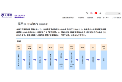 人事院は2025年11月14日、2026年の国家公務員採用総合職試験(春)の日程を公表した。申込みは2026年2月2日~24日に受け付け、第1次試験を3月15日に実施する。今回から「教養区分」は春の試験にも拡大し、春と秋合わせて大学4年生までの間に最大6回の受験を可能にする。