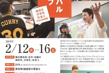 聖学院大学は、イーオンとの産学連携プログラムによる「グローバルキャンプ」を2019年2月12日から2月16日まで開催する。対象は埼玉県在住・在学・在勤の高校生、大学生、社会人。レッスンはすべて英語で行われる。参加費6,000円。申込締切日は2018年12月26日。