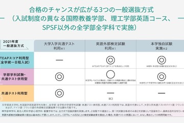 上智大学は2022年4月27日、2023年度一般選抜の共通テスト利用方式において、従来の4教科型に加えて3教科型を新設することを公表した。なお、2023年度一般選抜入学試験要項は2022年11月上旬公表予定となっている。
