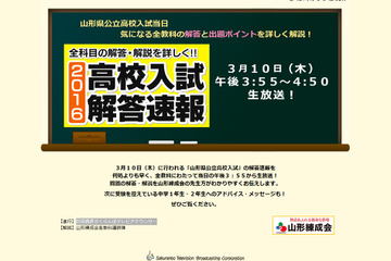 さくらんぼテレビは3月10日、午後3時55分から山形県公立高校入試の解答速報を生放送する。解答解説は山形練成会が務める。全日制公立の一般入学者定員6,814人に対し、志願者数は6,885人。倍率は1.01倍。