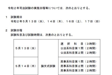 法務省は2025年12月3日、2026年(令和8年)の司法試験予備試験の実施日程について発表した。2026年の司法試験予備試験は、短答式試験を2026年7月19日、論文式試験を9月12日・13日、口述試験を2027年1月23日・24日に実施する。