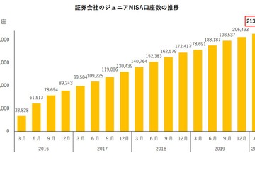 日本証券業協会は2020年7月2日、NISA・ジュニアNISA口座開設・利用状況調査結果を発表した。2020年3月末の証券会社のジュニアNISA口座数は21万3,585口座であり、2019年12月末と比較して、3.4%増加した。累計購入額は18.1%増加している。