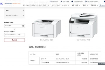 NECは2021年6月28日、企業や官公庁、教育現場等に向けて、小型化・軽量化を追求した世界最小クラスのA4カラーページプリンタ「Color MultiWriter 4C150」およびA4カラープリンタ複合機「Color MultiWriter 4F150」を発売した。