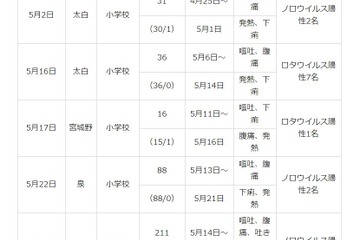 宮城県仙台市は2018年5月23日、仙台市太白区内の小学校でノロウィルスによる感染性胃腸炎の集団感染が疑われる事例が発生し、発症者が211人にのぼると発表した。仙台市内では5月に入ってから5件の集団感染が確認されている。