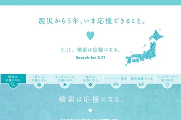 ヤフー(Yahoo! JAPAN)は3月11日午後11時59分まで、Yahoo!検索で「3.11」と検索すると、ユーザーに代わって被災地の復興支援団体へ寄付をする取組みを行う。金額はユーザー1人につき10円。復興支援特集企画のサイト「震災から5年、いま応援できること」も公開している。