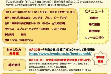 「弁当の日」応援プロジェクト事務局は、『大学生のための持ち寄り弁当の日料理教室』の開催を発表した。