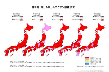 厚生労働省は2018年11月13日、2017年度の麻しん風しん予防接種の実施状況を公表した。第1期の接種率は麻しん・風しんそれぞれ96.0%だったが、第2期は93.4%と目標とされる95%以上を下回った。第2期については、47都道府県のうち37都道府県が95%未満となっている。