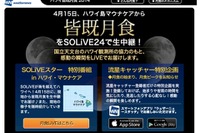 ウェザーニューズは4月11日、アメリカから太平洋の一部で4月15日に観測できる“皆既月食”を、24時間ライブ放送番組『SOLiVE24』において、ハワイ島から生中継することを発表した。皆既月食の始まりとピークを通知するサービスの登録受付も開始する。