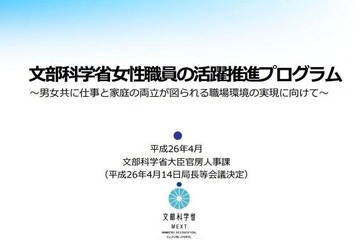 文部科学省は仕事と家庭の両立が図られる職場環境の実現を目指し「文部科学省女性職員の活躍推進プログラム」を策定した。家庭・子育てとキャリアの両立を目指す業務改善や必要な支援を行い、女性が働きやすい環境整備を推進していく。