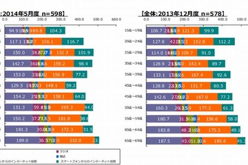 ジャストシステムは、2月25日、「モバイル&ソーシャルメディア月次定点調査~2014年度総集編」を発表した。スマートフォンの接触時間は、若年層で増加傾向。特に10代では、スマートフォンの接触時間が、PC、テレビを抜いたことが分かった。