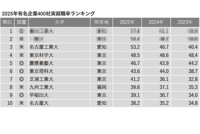 大学通信は2025年7月29日、2025年「有名企業400社実就職率ランキング」を発表した。3位は名古屋工業大、4位は東京科学大、5位は慶應義塾大。1位・2位は大学通信のWebサイトで確認できる。