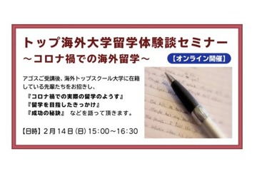海外トップ大学および大学院留学準備指導校として、国内屈指の合格実績を誇り、テスト対策教材開発などを行うアゴス・ジャパンは、「トップ海外大学留学体験談セミナー~コロナ禍での海外留学~」を2021年2月14日の午後3時よりオンラインにて開催する。
